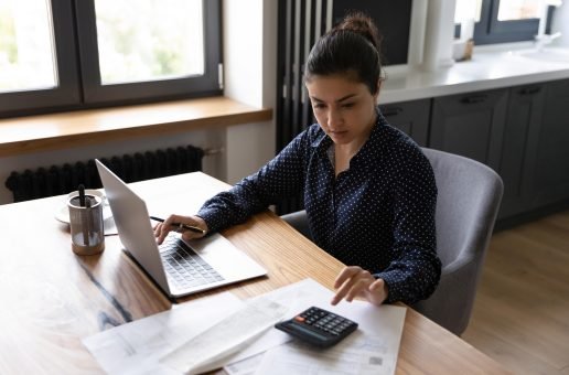 Bookkeeping. Busy millennial indian woman professional accountant preparing annual financial report checking result on calculator. Mixed race female freelancer counting tax rates declaring income